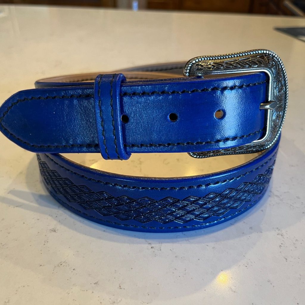 Blue veg tan leather, pre-dyed for making various projects from wallets to belts to dog collars. As a veg tan leather, Vaqueta tools and carves quite nicely, without you having to worry about the messy process of dyeing. Also, this leather comes highly recommended for laser engraving!