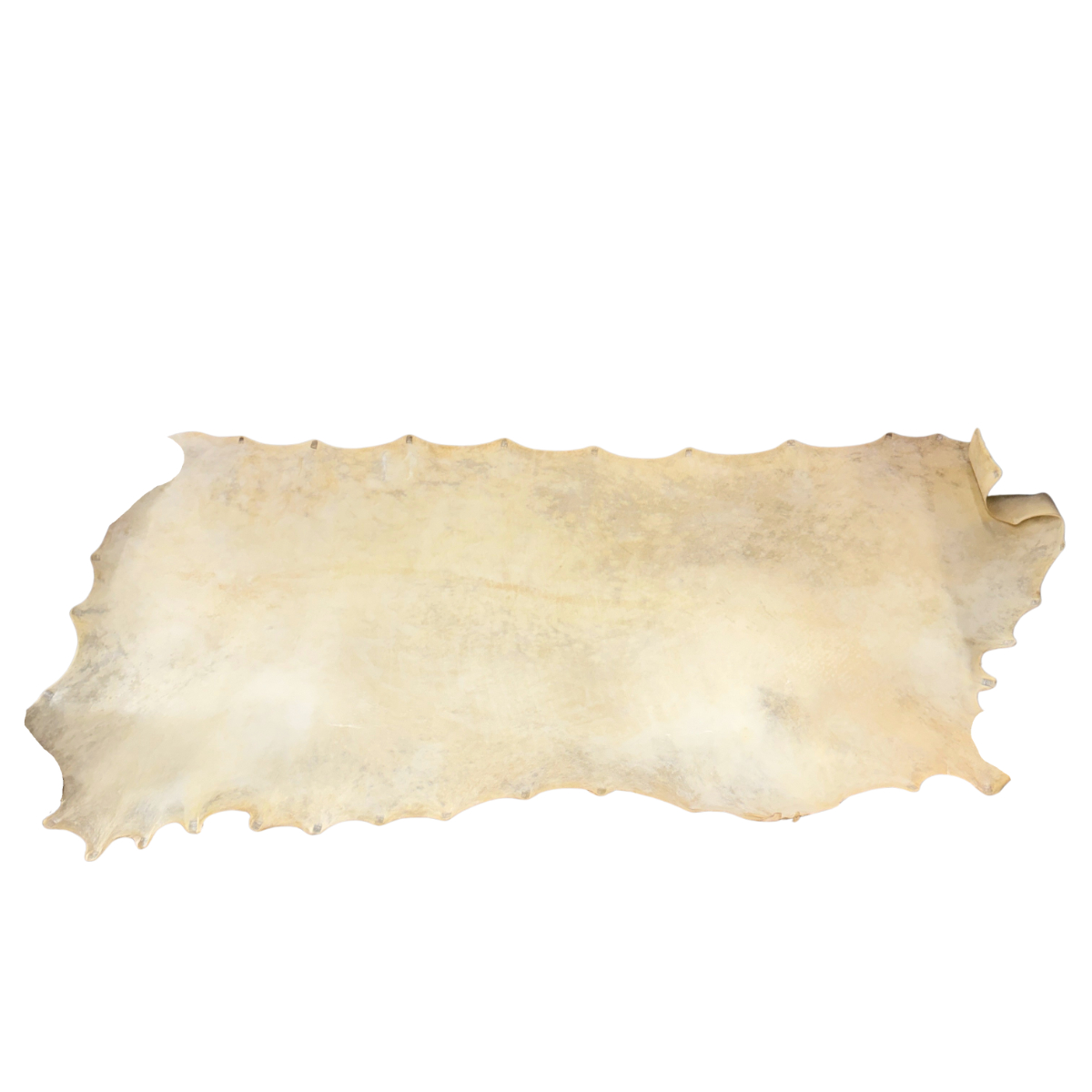 A white rawhide side for making drums, braiding, and various other similar projects. These pieces average about 20 square feet in size, and are about 5-6 ounces thick.